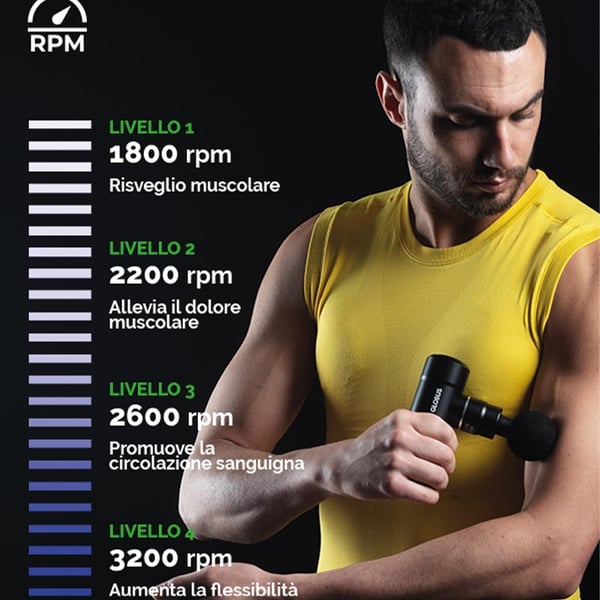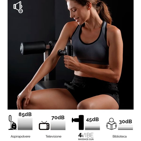 La pistola per massaggio 4 Vibe offre 4 livelli di velocità , rendendola adatta ad adattarsi alle diverse esigenze. Da un delicato massaggio per rilassare i muscoli ad un trattamento profondo per alleviare le tensioni dopo un'intensa attività fisica.