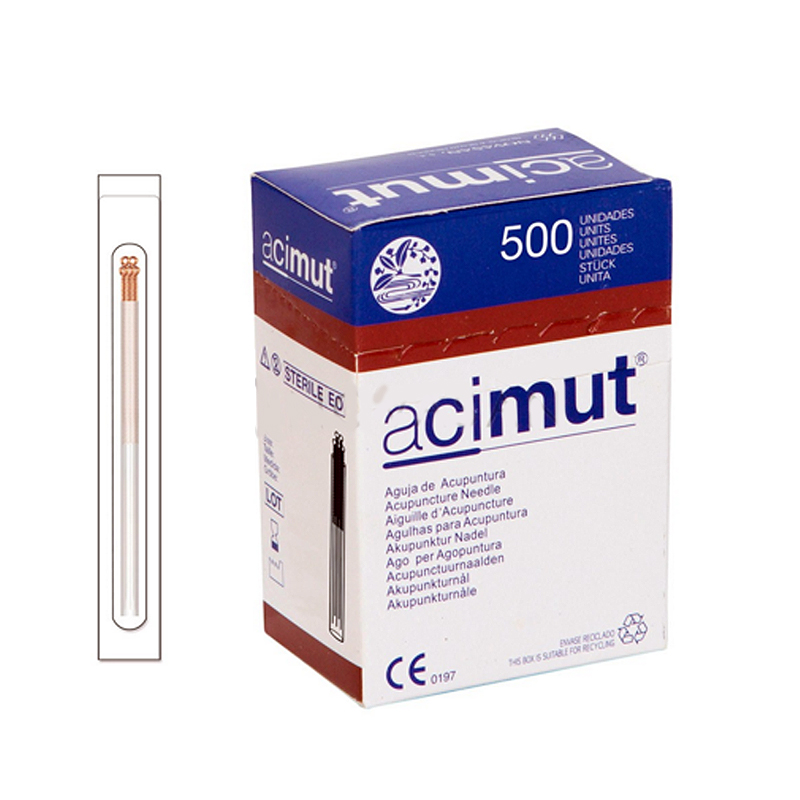 Ago per agopuntura monouso marca ACIMUT. Marchio premium di produzione propria, con design esclusivi sul mercato dal 1952, ai sensi delle normative europee ISO 9002/EN 46002, GMP e del Ministero della Salute cinese.