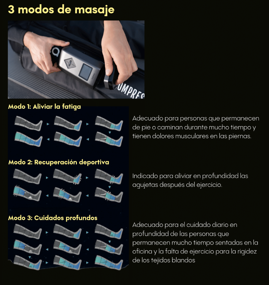 Attrezzatura professionale progettata per fornire massaggi ad aria compressa che favoriscono un profondo rilassamento, migliorano la circolazione sanguigna e accelerano il recupero muscolare. Ideale per atleti, impiegati e persone con uno stile di vita sedentario.