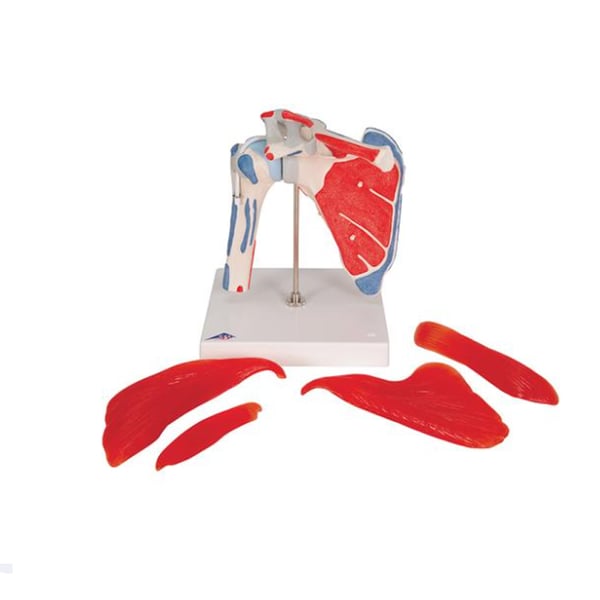 Oltre alla rappresentazione della muscolatura della cuffia dei rotatori, le superfici di origine e di inserzione dei muscoli della spalla sono evidenziate in diversi colori (origine = rosso; inserzione = blu). Sono rappresentati e possono essere staccati i seguenti muscoli: sottoscapolare, sovraspinato, infraspinato, piccolo rotondo.
