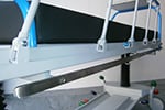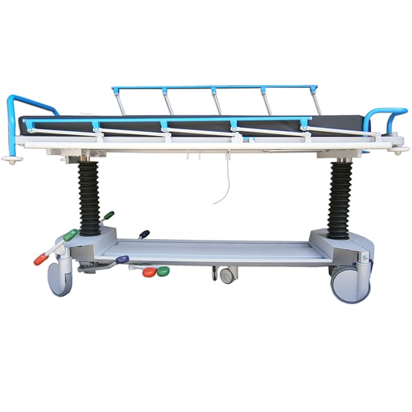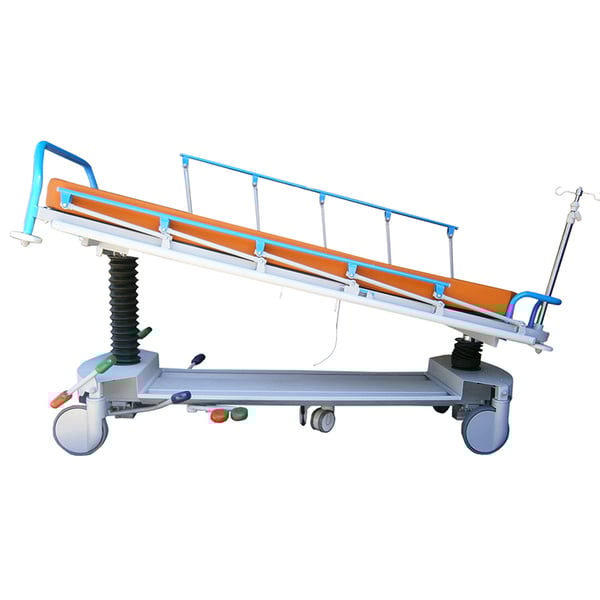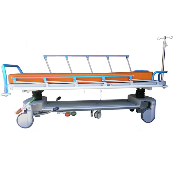 - Guide bilaterali e longitudinali per la circonferenza del paziente. Base con carenatura in metallo facile da pulire, con vani portaoggetti e porta bombole multiple di ossigeno. 2 coppie di ganci di scarico bilaterali. Asta portaflebo con 2 ganci, telescopica in acciaio inox e retrattile mediante ripiegamento in testa. Poggiapiedi di spinta e manovra, amovibile e staccabile.