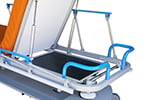 - Corrimano pieghevoli bilaterali con blocco automatico di sicurezza e protezione anti-shock. Carrello con 4 ruote da 200 mm, carenate in plastica, con freno totale simultaneo centralizzato e servoruota direzionale, motorizzate su entrambi i lati della barella, con sistema di ralla conduttiva da 125 mm. con ammortizzazione. Collegamento equipotenziale. Maniglie di spinta ergonomiche per poggiatesta, 4 ruote paracolpi e strisce laterali antigraffio.