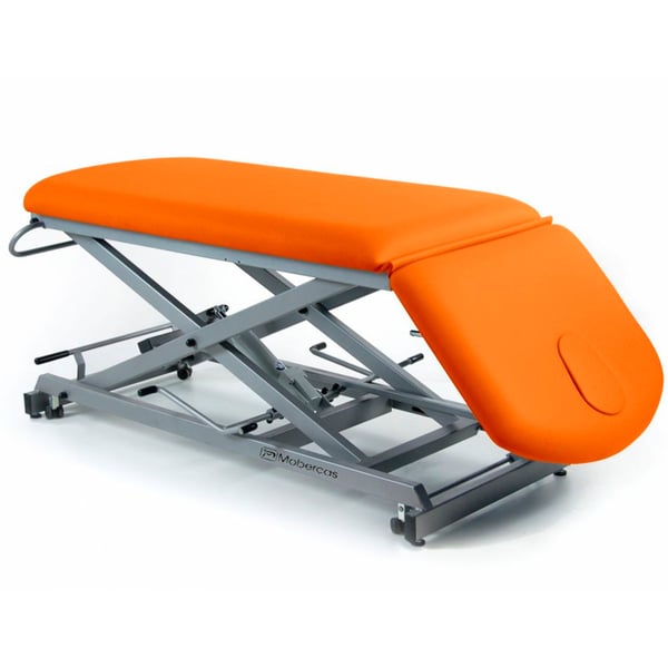 Barella da visita idraulica di due corpi. Ha lo schienale reclinabile in negativo e l'alzata dritta senza spostamento laterale, con porta carta igienica e cuffia facciale . Disponibile con opzione ruote a scomparsa .