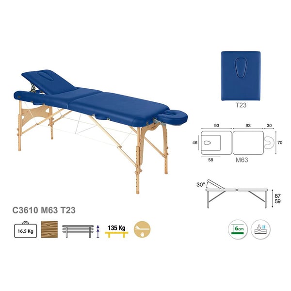 Nuova e versatile barella pieghevole Ecoposturale a due corpi, ideale per tutti i tipi di specialità. Si compone di una testiera regolabile e di una struttura in legno naturale.