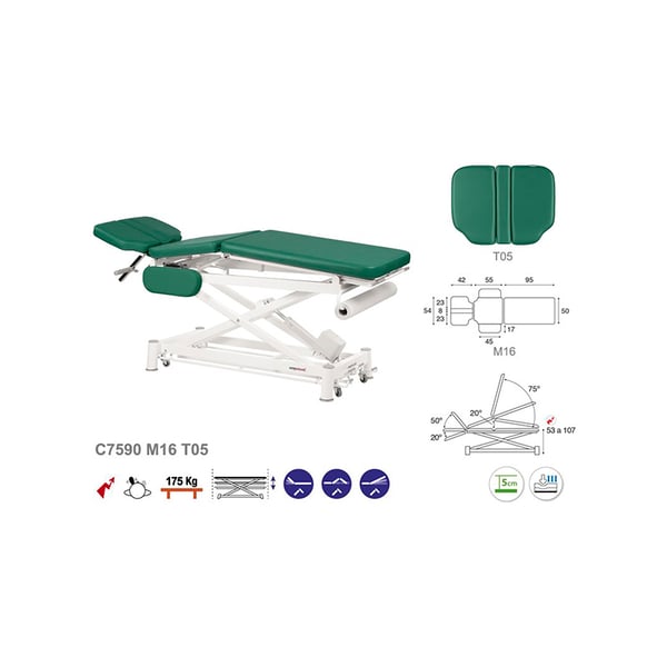 Nuova e versatile barella elettrica Ecoposturale multifunzionale , a tre corpi, perfetta per qualsiasi tipo di trattamento. È costituito da un sistema di sollevamento elettrico e da una struttura bianca a forbice in acciaio e ruote retrattili che ne facilitano lo spostamento laterale. Allo stesso modo, ha una testa oscillante per un maggiore comfort. Dispone inoltre di imbottitura in espanso di vari spessori e rivestimento in classe M2.