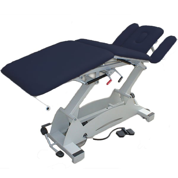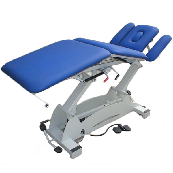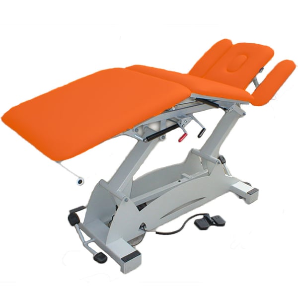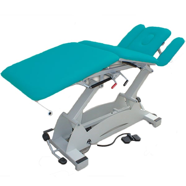 - Il letto della barella con corpi ripiegabili a 5 pistoni, sollevabile da 48 cm a 90 cm tramite sistema elettrico mediante pedaliera posizionabile su entrambi i lati della barella, consente al professionista di adattarsi facilmente alle esigenze terapia da eseguire.