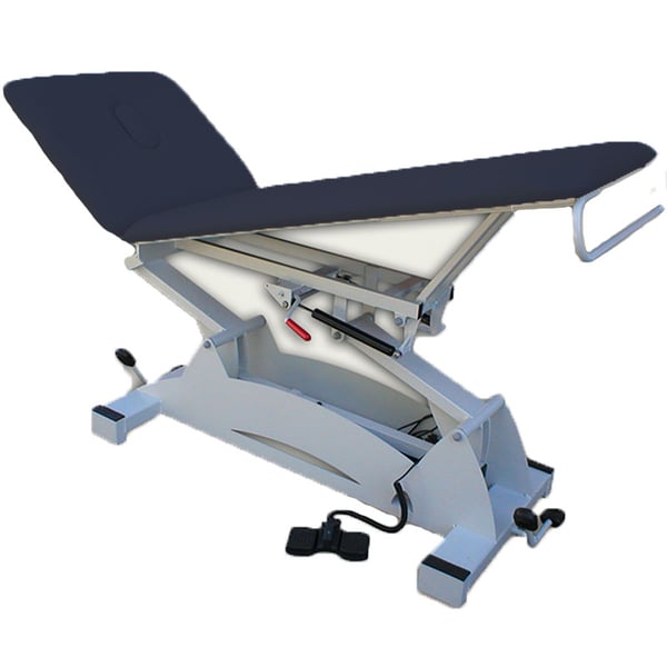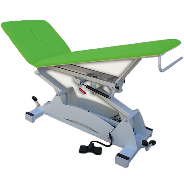 - Il letto della barella con 2 corpi ripiegabili a pistoni elevabili da 48 cm a 90 cm tramite sistema elettrico mediante pedaliera posizionabile su entrambi i lati della barella, consentendo al professionista di adattarsi facilmente alle esigenze terapia da eseguire.