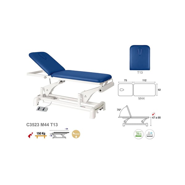 Nuova barella Ecoposturale a due corpi, moderna e versatile, con sistema di sollevamento elettrico e struttura a bielletta bianca. È costituito da una testa oscillante, un tappo facciale , un'imbottitura in schiuma di vari gradi di rigidità e un rivestimento di classe M2. Allo stesso modo, ha una struttura in acciaio di bielle con cuscinetti e ruote retrattili che ne facilitano lo spostamento laterale .