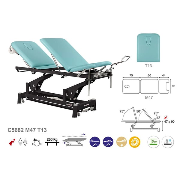 Innovativa barella elettrica Ecoposturale , a tre corpi, ideale per le specialità . È costituita da una struttura in acciaio con ruote retrattili e un sistema di sollevamento elettrico che facilitano lo spostamento della barella. Inoltre, è dotato di testa oscillante con tappo facciale , imbottitura in schiuma di diverso spessore e rivestimento di classe M2.