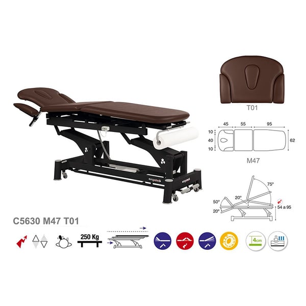 Nuova e versatile barella elettrica Ecoposturale multifunzionale , a tre corpi, perfetta per qualsiasi tipo di trattamento. È costituito da un sistema di sollevamento elettrico e da una struttura in acciaio di bielle con cuscinetti e ruote retrattili che ne facilitano lo spostamento laterale. Dispone inoltre di testina oscillante e cuffia facciale per un maggiore comfort. Dispone inoltre di imbottitura in espanso di vari spessori e rivestimento in classe M2.