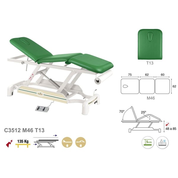 Nuova barella Ecoposturale a due corpi, moderna e versatile, con sistema di sollevamento elettrico e struttura a bielletta bianca. È composto da testiera con tassello facciale , imbottitura in espanso di vari gradi di portanza e rivestimento in classe M2. Allo stesso modo, ha una struttura in acciaio di bielle con cuscinetti e ruote retrattili che ne facilitano lo spostamento laterale .