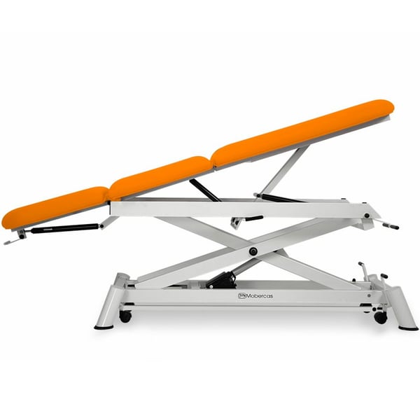 Barella elettrica per osteopatia a tre sezioni, con schienale reclinabile negativamente, piega centrale e alzata dritta senza spostamento laterale. Include cappuccio facciale e ruote retrattili . Consiste in una posizione Trendelenburg che utilizza due pistoni a gas.