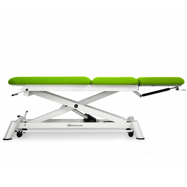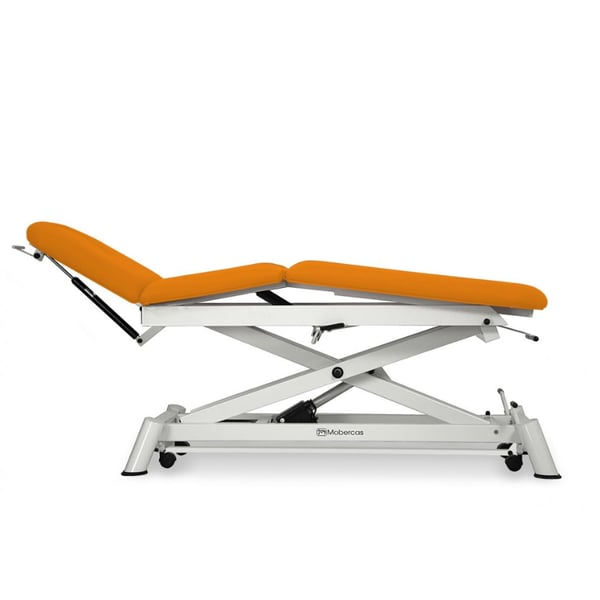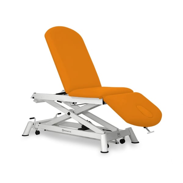 Barella elettrica a tre sezioni, con schienale reclinabile in negativo e alzata dritta senza spostamento laterale . Appositamente progettato per trattamenti di osteopatia .