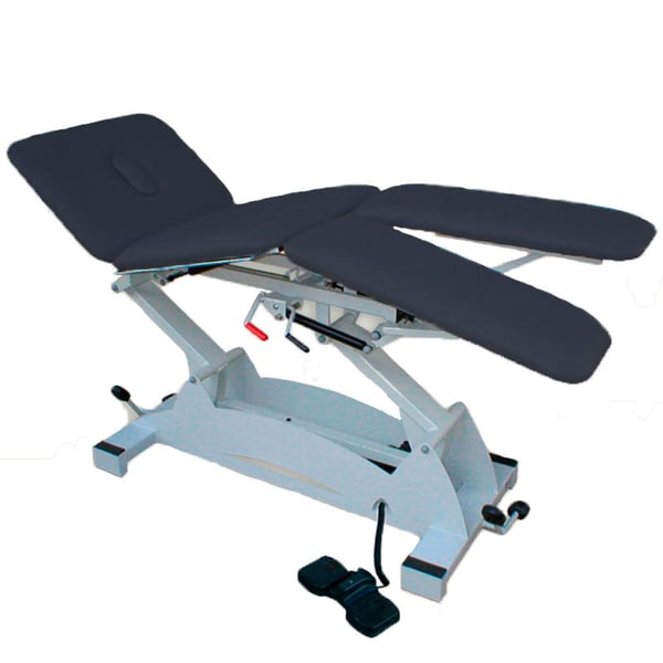 - Il letto della barella con 4 corpi ripiegabili a pistoni elevabile da 48 cm a 90 cm tramite sistema elettrico mediante pedaliera posizionabile su entrambi i lati della barella, consentendo al professionista di adattarsi facilmente alle esigenze terapia da eseguire.