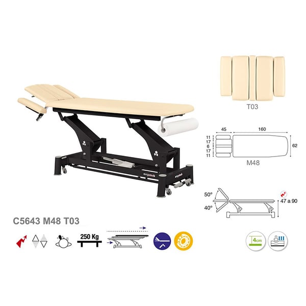 Innovativa barella elettrica con modalità tecnica Ecoposturale, composta da tre corpi e con sistema di sollevamento elettrico . È costituito da una struttura in acciaio di bielle con cuscinetti e ruote retrattili che facilitano lo spostamento laterale. Ha imbottitura in schiuma di vari livelli di spessore e rivestimento di classe M2. Inoltre, è dotato di una testa inclinabile che include una cuffia facciale che offre maggiore comfort al professionista e al paziente.