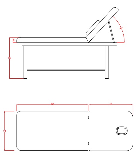 Barella fissa a due sezioni con struttura in metallo bianco, inclinazione dello schienale con regolazione manuale, cuscino poggiatesta sfoderabile con foro facciale e rivestimento in PVC bianco di facile pulizia.