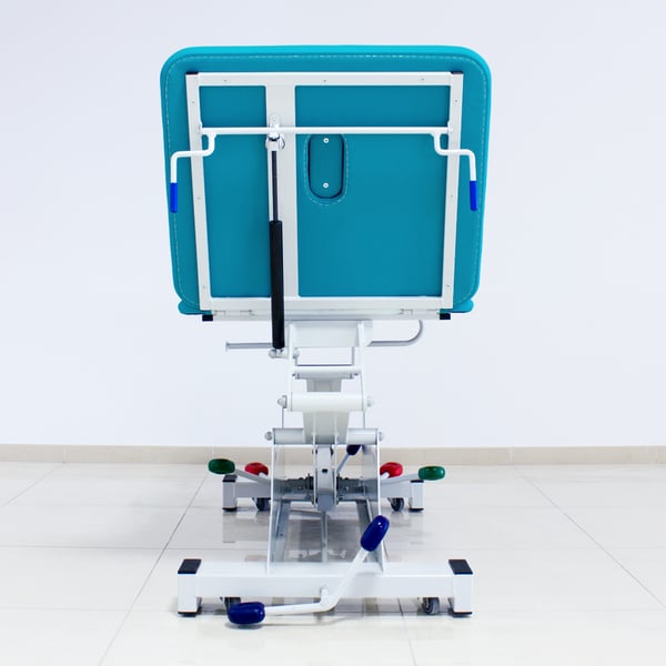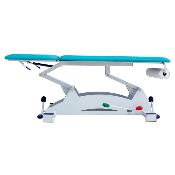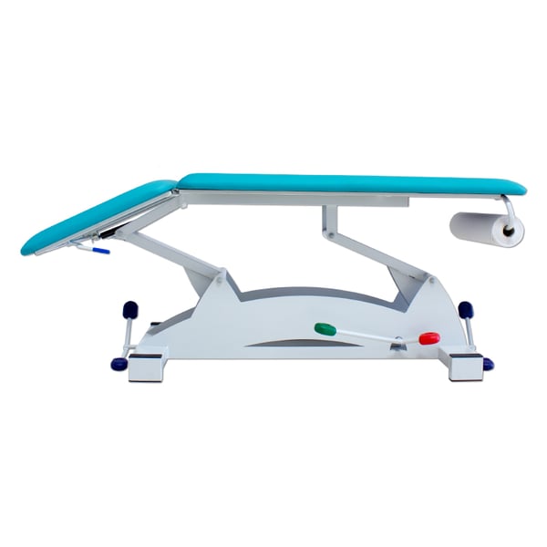 - Il letto della barella è dotato di 2 corpi ripiegabili a pistone con leve bilaterali. L'altezza può essere aumentata da 48 cm a 90 cm tramite un sistema idraulico a pedale posto al centro della barella, permettendo al professionista di adattarsi facilmente alla terapia da eseguire.