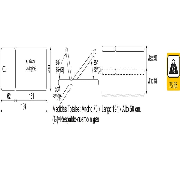 - Elevazione dell'altezza tramite sistema a pedale idraulico. Altezza minima. 48 cm e altezza massima. 90 cm