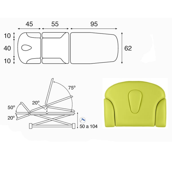 - Corpi reclinabili tramite: Parte della testa tramite molla a gas, parte della cifosi tramite molla a gas, parte dei piedi tramite molla a gas.