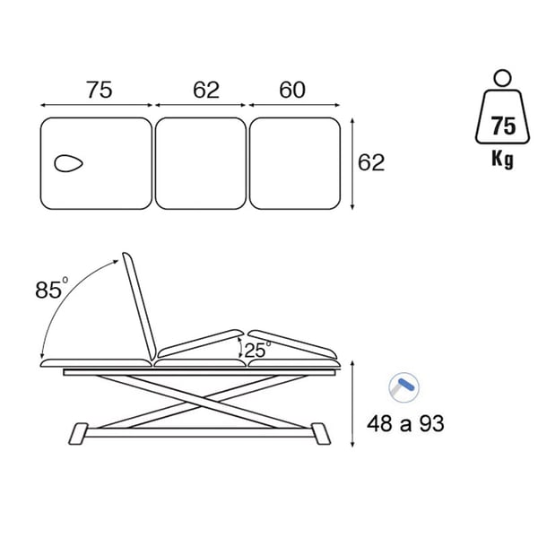 Barella idraulica ecoposturale: tre corpi, con struttura a forbice bianca e foro facciale (62 x 198 cm)