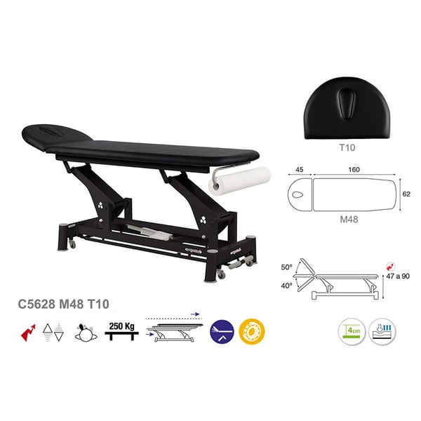 Innovativa barella elettrica con modalità tecnica Ecoposturale, composta da tre corpi e con sistema di sollevamento elettrico . È costituito da una struttura in acciaio di bielle con cuscinetti e ruote retrattili che facilitano lo spostamento laterale. Ha imbottitura in schiuma di vari livelli di spessore e rivestimento di classe M2. Inoltre, è dotato di una testa inclinabile che include una cuffia facciale che offre maggiore comfort al professionista e al paziente.