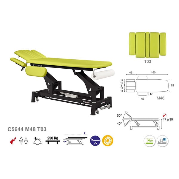 Innovativa barella elettrica con modalità tecnica Ecoposturale, composta da due corpi e con sistema di sollevamento elettrico . È costituito da una struttura in acciaio di bielle con cuscinetti e ruote retrattili che facilitano lo spostamento laterale. Ha imbottitura in schiuma di vari livelli di spessore e rivestimento di classe M2. Inoltre, è dotato di bracci pieghevoli e testa inclinabile con cuffia facciale, che offre un maggiore comfort al professionista e al paziente.