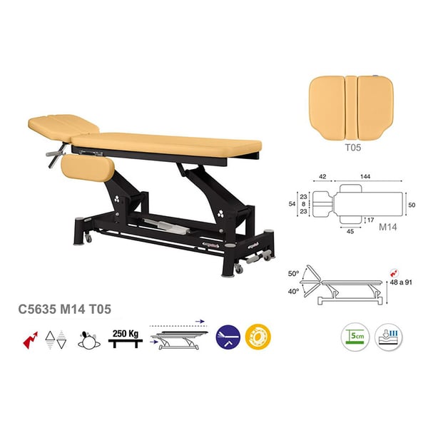 Innovativa barella elettrica con modalità tecnica Ecoposturale, composta da due corpi e con sistema di sollevamento elettrico . È costituito da una struttura in acciaio di bielle con cuscinetti e ruote retrattili che facilitano lo spostamento laterale. Ha imbottitura in schiuma di vari livelli di spessore e rivestimento di classe M2. Inoltre, è dotato di bracci pieghevoli e testa inclinabile con calotta facciale, che offre un maggiore comfort al professionista e al paziente.