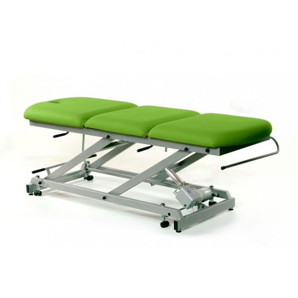 Barella da visita elettrica a tre sezioni, con piega centrale manuale, porta carta igienica e calotta facciale . Offre la possibilità di aggiungere ruote a scomparsa . Appositamente studiato per trattamenti fisioterapici e riabilitativi .