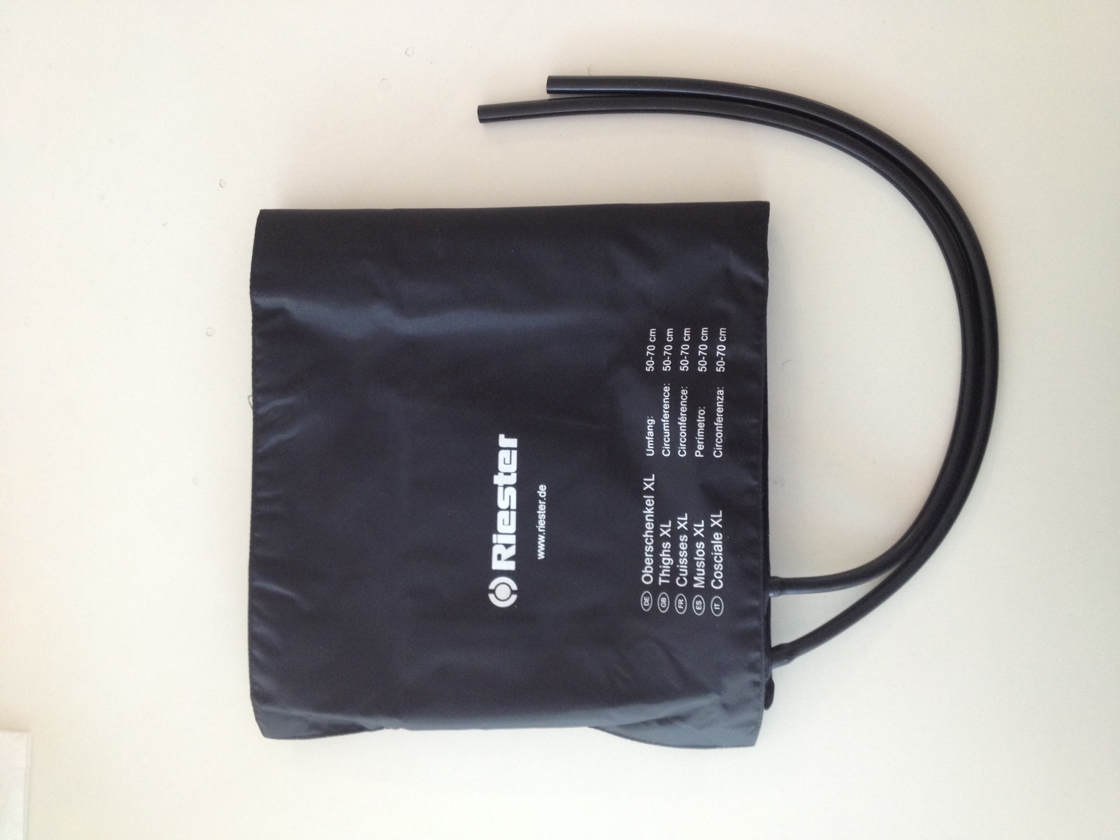 Descrizione Bracciale per tensiometro Riester, nero, 2 tubi, adulti, coscia XL 100 x 26 cm. Perimetro 50-70 cm (FINO ESAURIMENTO SCORTE)