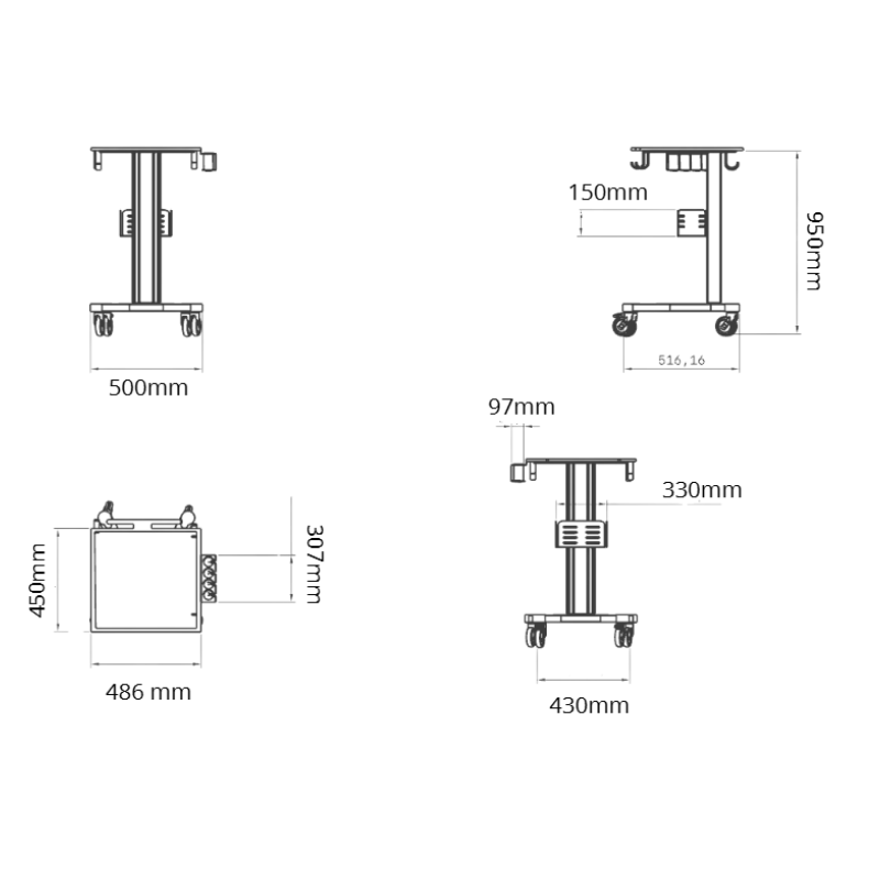 Ampio vassoio superiore (486 × 450 mm) per l'ecografo e gli accessori.