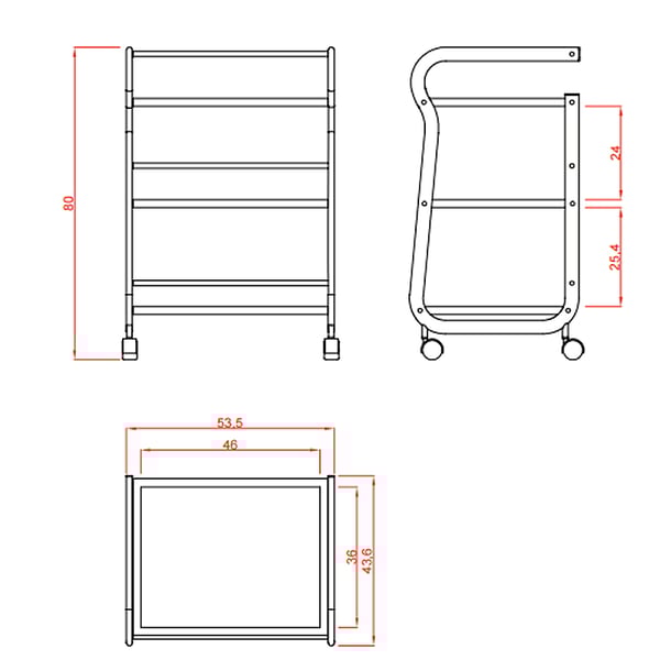 Questo carrello minimalista combina stile e funzionalità con la sua struttura in metallo bianco e 3 ripiani in vetro traslucido, supportando fino a 15-20 kg per ripiano . Facile da spostare grazie alle 4 ruote e alla maniglia posteriore, misura 53,5 x 43 x 80 cm e pesa 14 kg, ideale per tenere tutto in ordine con un design moderno.