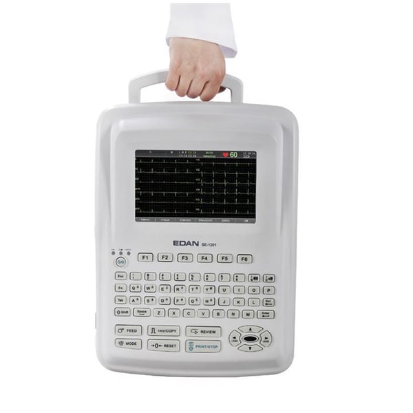 Lui EDAN SE 1201 ECG a 12 tracce è un elettrocardiografo automatico, manuale, a ritmo RR o con memoria a 12 canali, con uno schermo a colori da 7" che consente l'acquisizione e la visualizzazione simultanea di 12 canali, con 6 velocità e 5 sensibilità.