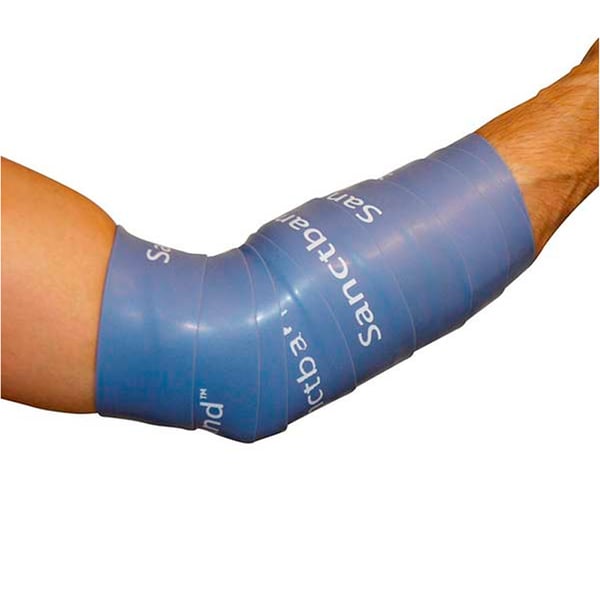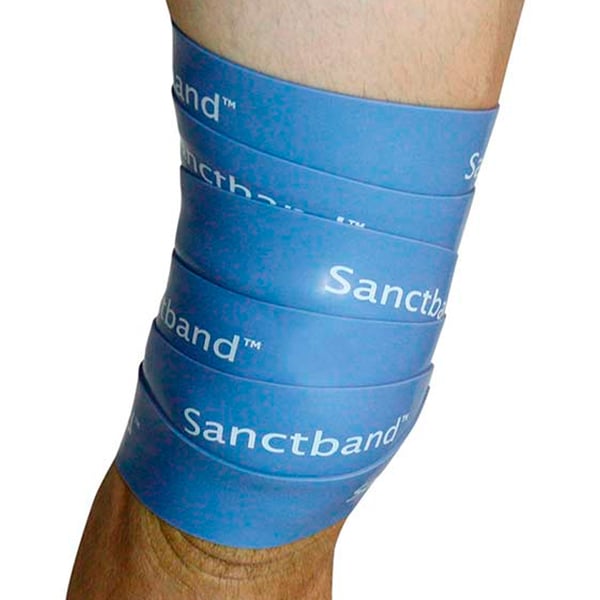 Flossband di Sanctband è una fascia in gomma naturale lunga 2 metri e larga 5 cm, circa 4-7 volte più spessa di una normale fascia da palestra . È forte e avvolge saldamente la parte del corpo o l'articolazione da trattare.