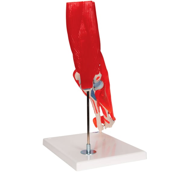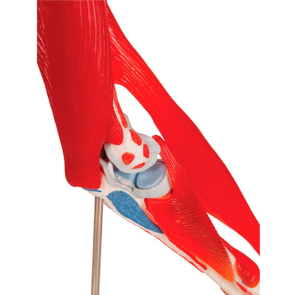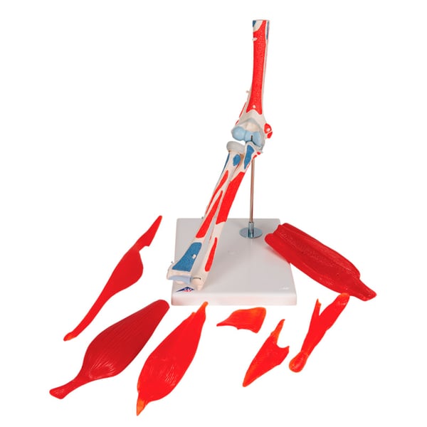 Questo modello mostra il gomito destro di un uomo con tutti i muscoli e le origini e inserzioni muscolari dell'omero, nonché del radio e dell'ulna . Le superfici delle inserzioni e delle origini muscolari sono evidenziate e codificate a colori (origine = rosso; inserzione = blu) per scopi didattici.