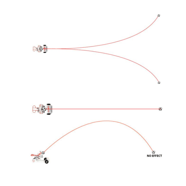 Effetto curvo : un lancio curvo si ottiene mantenendo le due ruote di tiro allo stesso livello e regolandole su velocità diverse. La palla ruoterà attorno al suo asse verticale e avrà un percorso curvo.