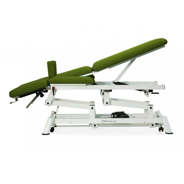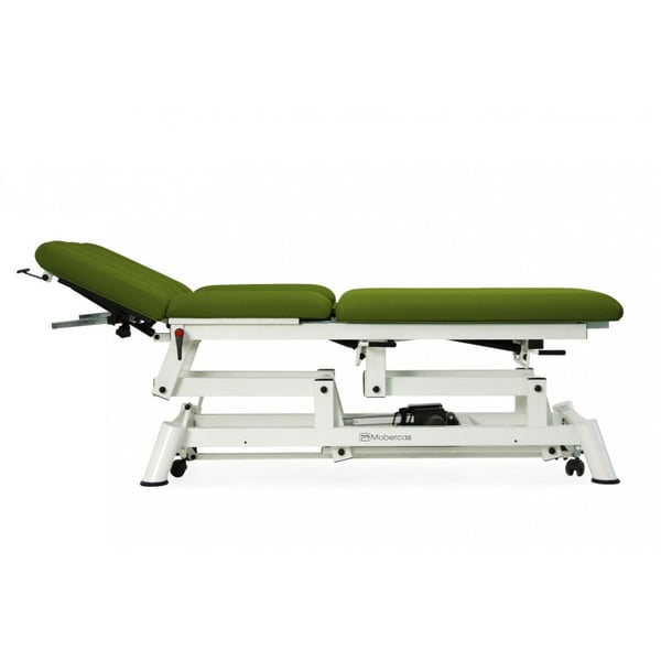 Lettino elettrico multifunzione per osteopatia: nove corpi, con schienale reclinabile negativo, braccioli, piega centrale e Trendelenburg con ruote a scomparsa