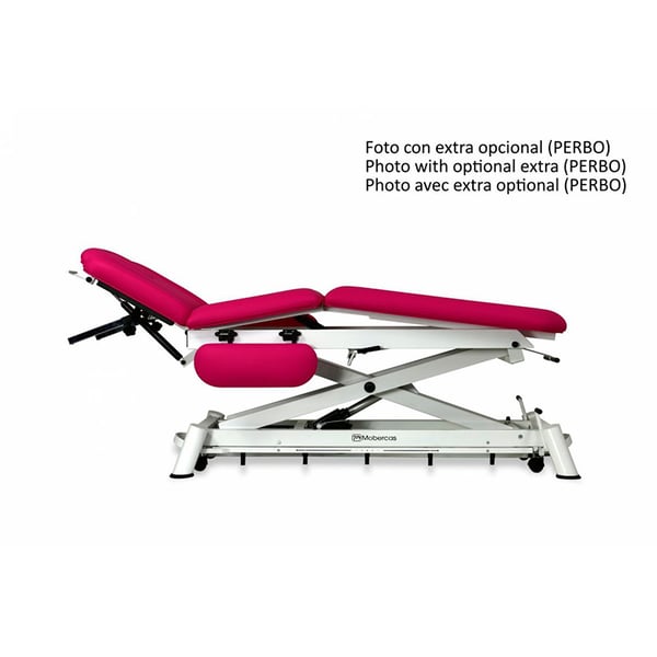 Barella elettrica multifunzionale per osteopatia di sette corpi con schienale reclinabile negativo e alzata dritta senza movimento laterale . Include braccioli all'altezza dello schienale regolabili in altezza e larghezza, braccioli piatti imbottiti, visiera e ruote a scomparsa . Ha anche l'opzione con posizione Trendelenburg per mezzo di due pistoni a gas.