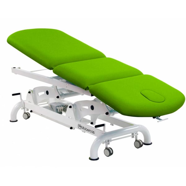 Barella elettrica multifunzione per osteopatia a tre corpi con tre motori per la regolazione dell'altezza, dello schienale e della pediera tramite comando manuale. Ha uno schienale reclinabile negativo . Comprende un portarotolo, cappuccio facciale e ruote a scomparsa.Ha anche l'opzione con una posizione Trendelenburg per mezzo di due pistoni a gas.