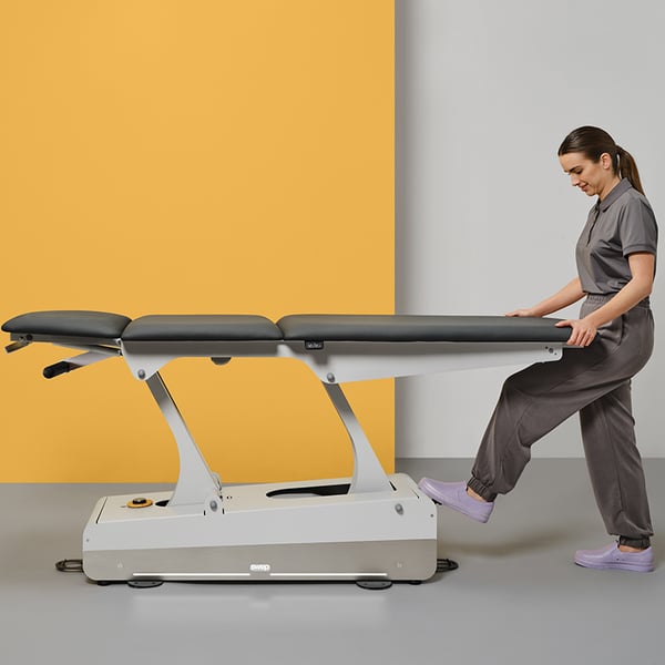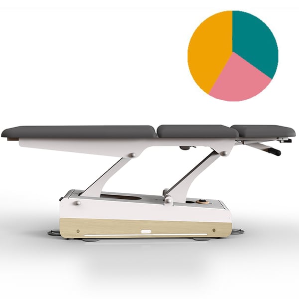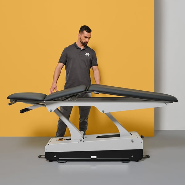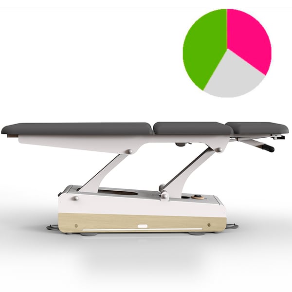 Lettino elettrico per fisioterapia Swop 3 Pro Physio: tre sezioni con poggiatesta corto, sezione centrale motorizzata, rivestimento personalizzabile e senza cuciture, con doppio pistone, un modello rivoluzionario