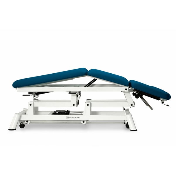 Barella elettrica per osteopatia a cinque corpi con schienale reclinabile negativamente , braccioli sullo schienale regolabili in altezza e in apertura, con ruote retrattili e tappo facciale . Disponibile con l'opzione del modello trendelenburg compensato con piega centrale.