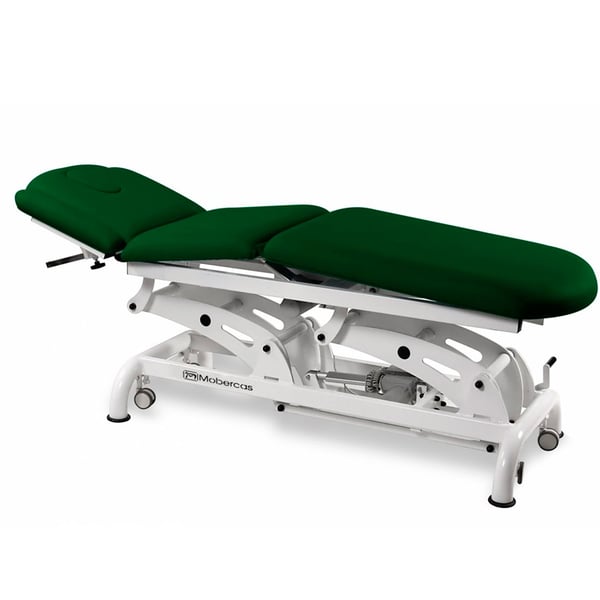 Lettino elettrico per osteopatia a tre sezioni con tre motori per la regolazione dell'altezza, piega centrale e pedana a comando manuale. Ha uno schienale reclinabile negativo. Include portarotolo, cappuccio facciale e ruote a scomparsa. Disponibile anche il modello con braccioli.