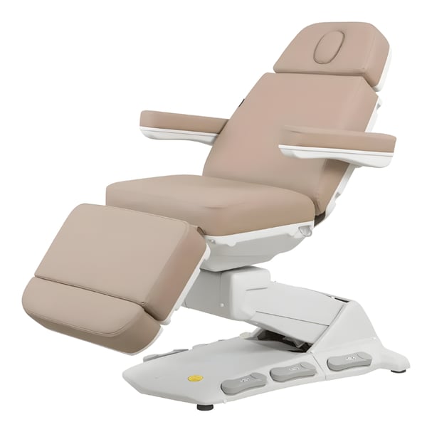 Si distingue per il sistema di riscaldamento integrato a due livelli di temperatura , che offre maggiore comfort al cliente durante il trattamento, e per il sistema di rotazione di ±110° con blocco manuale, ideale per ottimizzare lo spazio di lavoro nella cabina . Inoltre, incorpora braccioli girevoli, poggiatesta estensibile e poggiapiedi estensibile, offrendo un'ergonomia superiore sia per il professionista che per il paziente.
