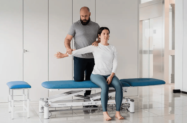 Lettino elettrico per fisioterapia a due sezioni, con schienale reclinabile e altezza regolabile tramite motore elettrico . Consigliato per terapia, massaggi e visite mediche. Include portasciugamani.