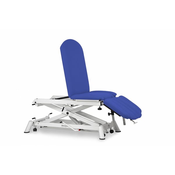 E' una barella idraulica che ha la regolazione in altezza per mezzo di un motore idraulico, schienale reclinabile tramite pistone a gas e foro facciale .