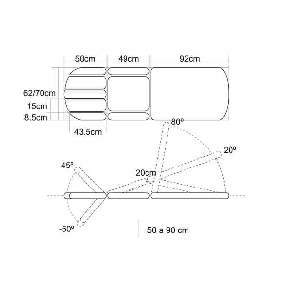 - Gambe: pedana (terzo corpo) elevabile/reclinabile