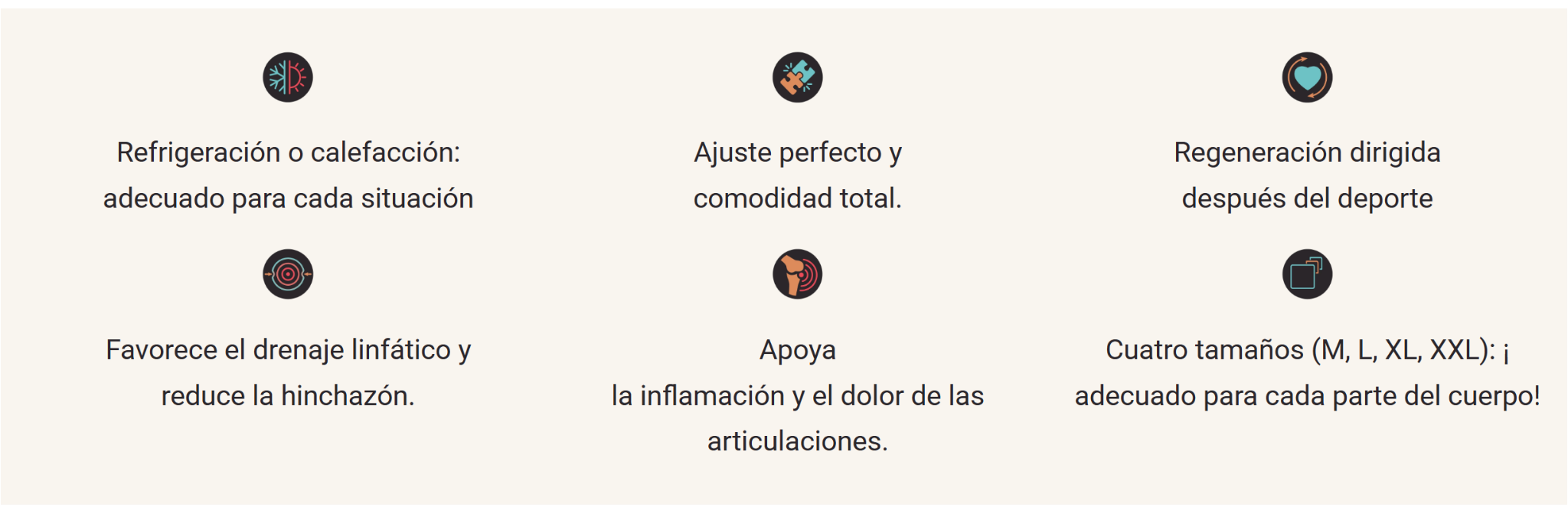 Rappresentano una soluzione pratica ed efficace per ottimizzare i processi di recupero e migliorare il benessere muscolare e articolare senza ricorrere a scomodi impacchi di ghiaccio e borse dell'acqua calda , e sperimentare un modo più comodo, sicuro ed efficiente di applicare la terapia del freddo e del caldo.