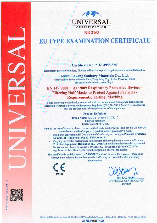 - Certificato europeo CE 2163. Le maschere sono certificate CE per i prodotti della categoria III. Le maschere hanno superato con successo i test effettuati e sono conformi ai requisiti previsti dal Regolamento sui dispositivi di protezione individuale (UE) 2016/425 e dalle norme armonizzate, garantite da valutazioni basate sull'allegato 7 (modulo C) o allegato 8 (modulo d).
