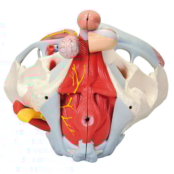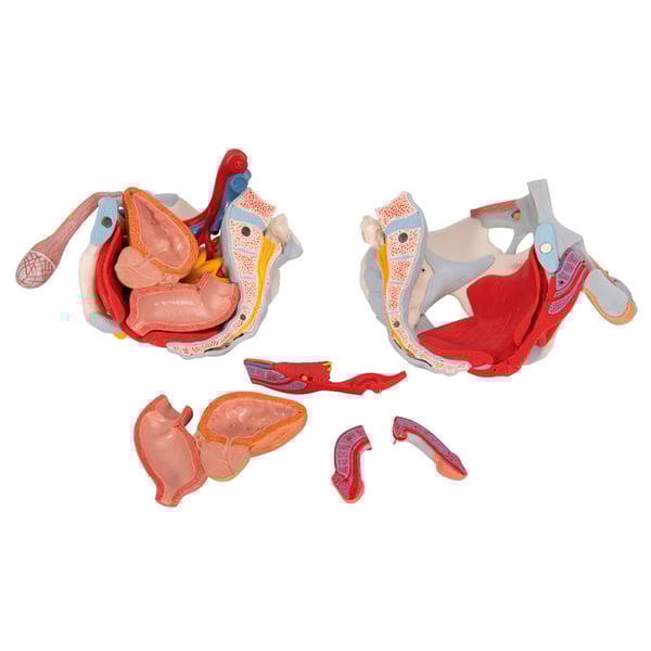 Il modello anatomico del bacino maschile in sette parti ci mostra con grande dettaglio la relazione spaziale di ossa, legamenti, vasi e nervi, nonché la muscolatura del pavimento pelvico e gli organi esterni del bacino e delle gonadi maschili.
