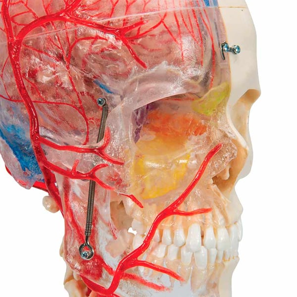 - La possibilità di conoscere le strutture nella metà trasparente del cranio e le ossa nella metà ossea, rende questo cranio di grande interesse didattico.