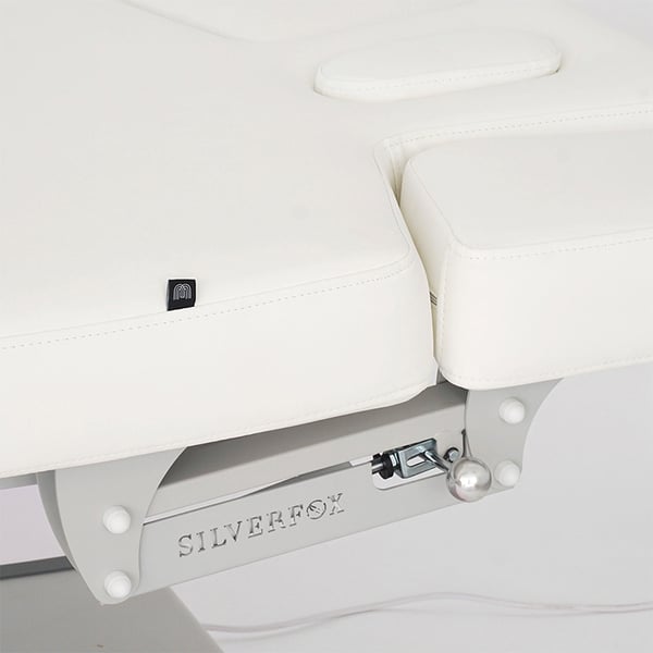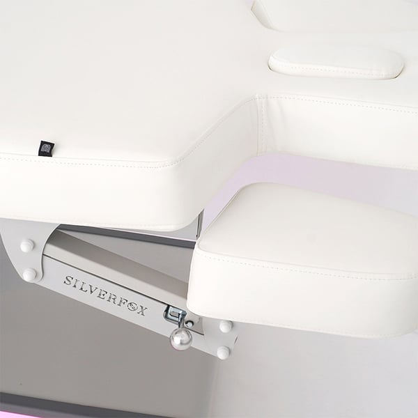 La barella Nush ha tre motori che regolano l'altezza e l'inclinazione dello schienale e del poggiapiedi. Ha un'imbottitura estremamente confortevole con rivestimento in PU bianco di alta qualità, un materasso monoblocco a tre sezioni, braccioli regolabili e un poggiatesta con foro facciale.